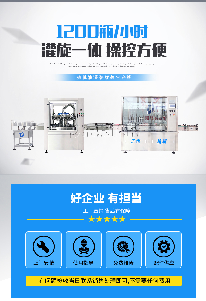 1、本橄欖油灌裝旋蓋機(jī)生產(chǎn)線采用機(jī)械手旋蓋,配備自動(dòng)打滑裝置,防止瓶蓋損傷。